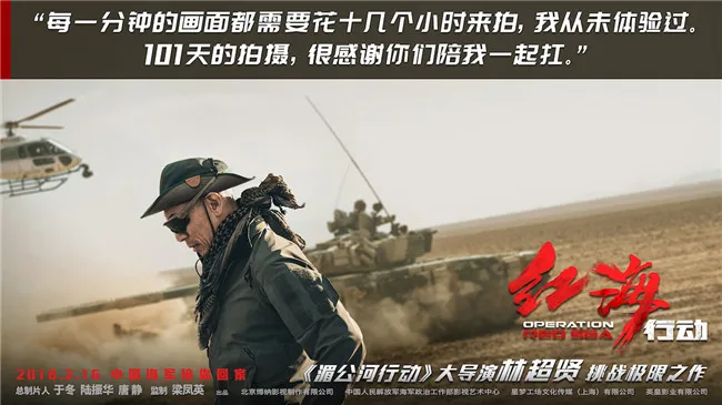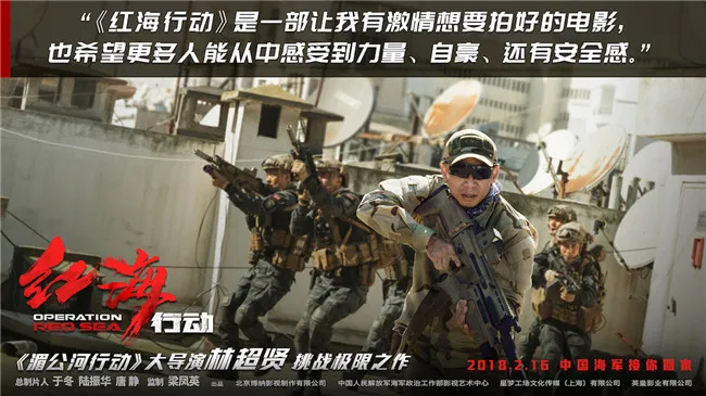 《紅海行動》由林超賢導演,樑鳳英監製,張譯、黃景瑜、海清、杜江、蔣璐霞、尹昉、郭家豪、王雨甜、麥亨利等主演,張涵予特別出演。由博納影業集團股份有限公司、中國人民解放軍海軍政治工作部影視藝術中心、星夢工場文化傳媒(上海)有限公司、英皇影業有限公司聯合出品,於冬、陸振華、唐靜總製片人。今年大年初一,與《紅海行動》相約影院,在熱血澎湃中看蛟龍出海,揚我國威!