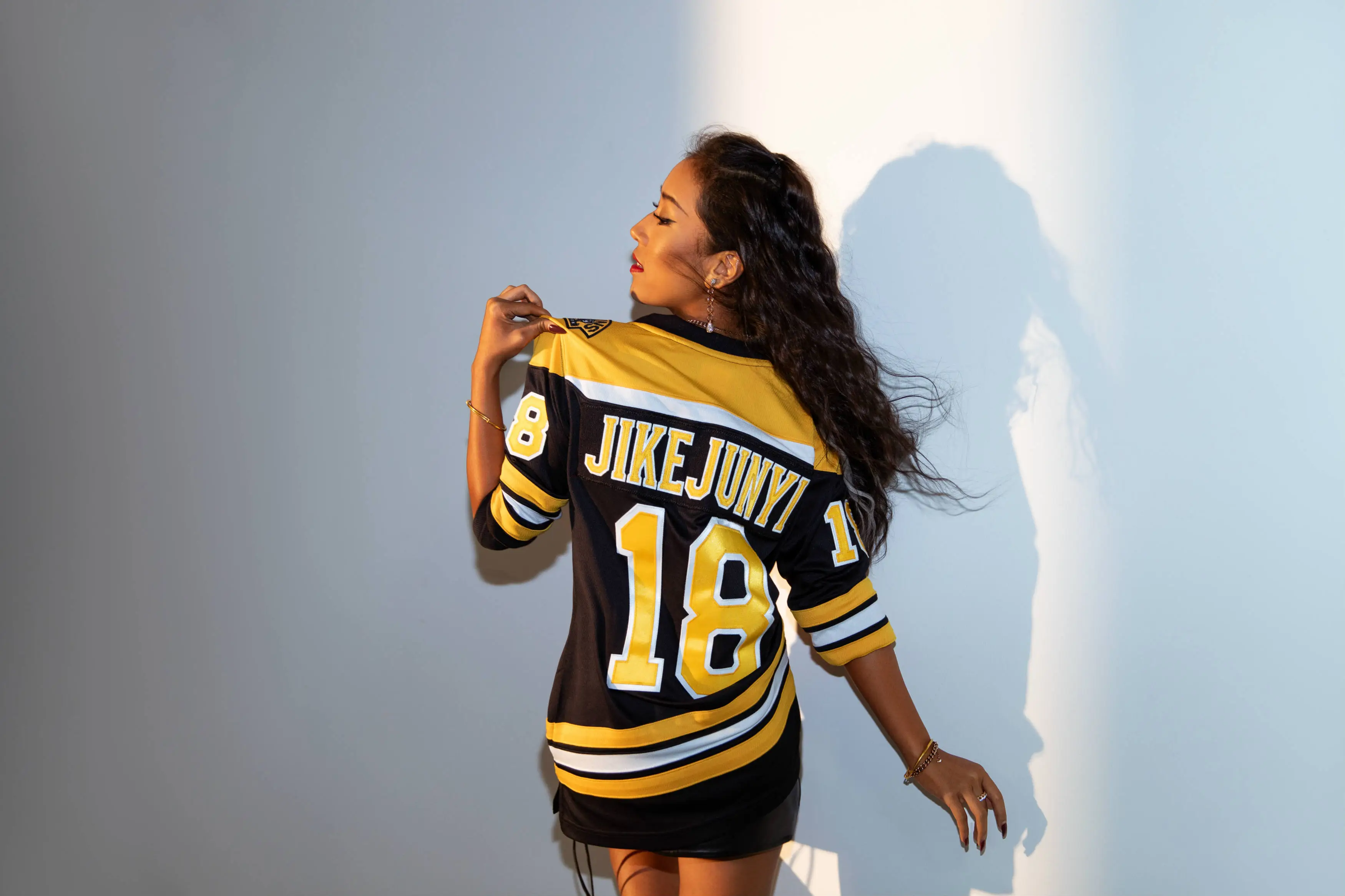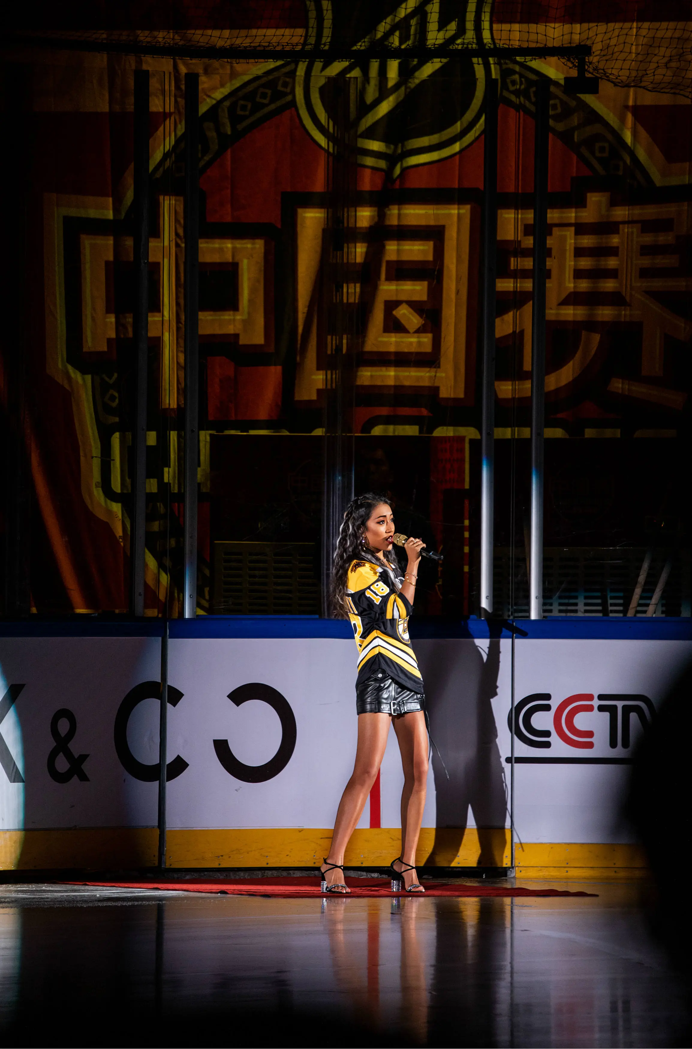 當晚,吉克雋逸身穿印有自己名字的專屬球衣出席活動,下身搭配黑色短皮裙顯得整個人充滿了活力又不失女人味。跟NHL中國賽第一場一樣,吉克雋逸首先演唱了自己的歌曲《I’m your fan》點燃全場的熱情,接着帶領全場共同演唱國歌,聲音高亢嘹亮迴盪整個賽場。